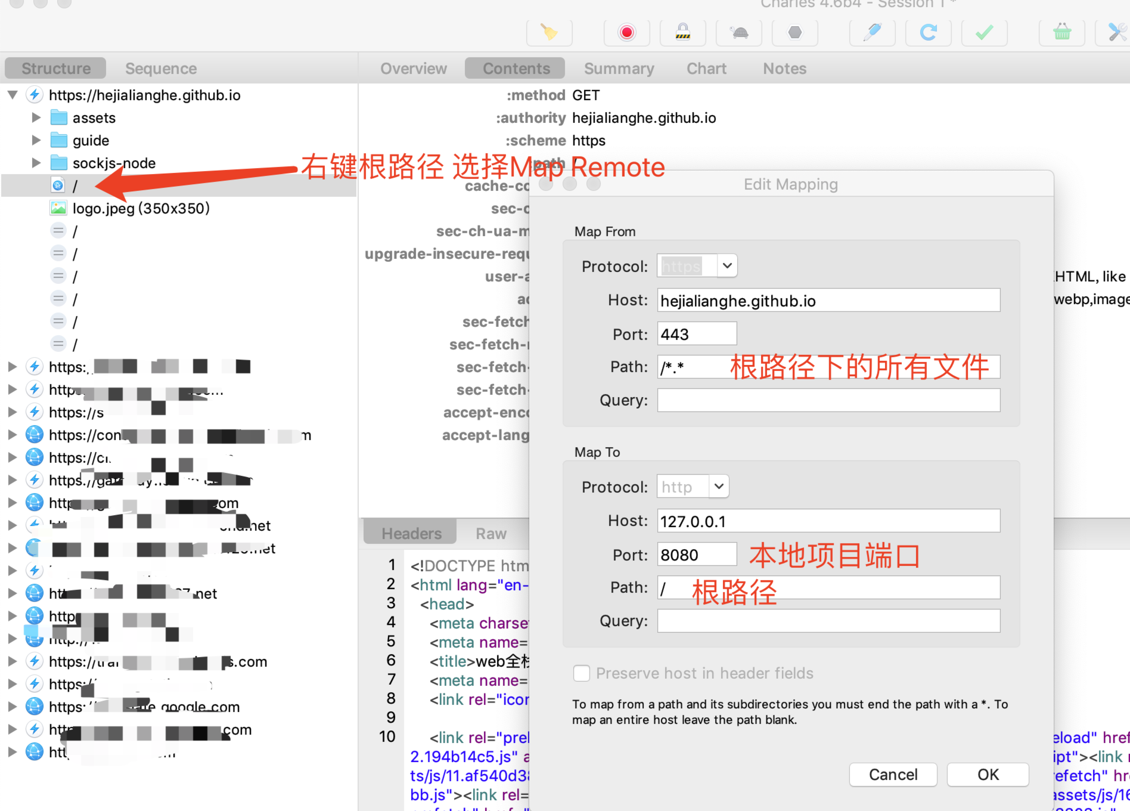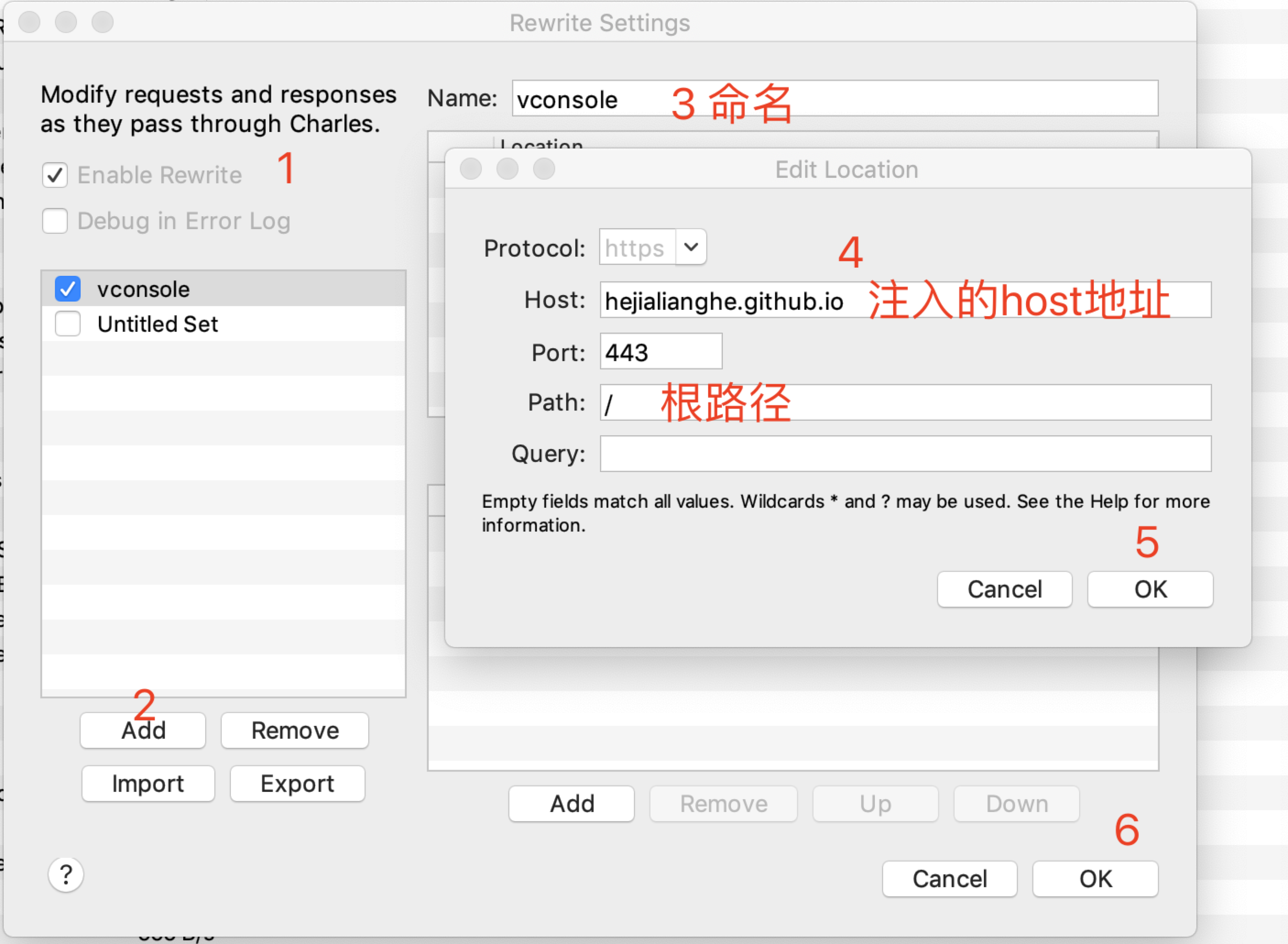 • 在Host一栏设置要解析的域名,也可以*表示所有的HTTPS都做解析,port:443;点击ok后重启charles。